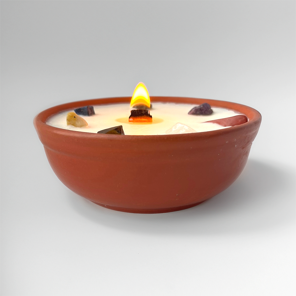 Elevate your wellness product offerings with our Clay Pot Candle, infused with the essence of meditation and spiritual balance. Each candle features 200g of pure soy wax and is adorned with 7 Chakra crystals, designed to promote calmness and alignment. Housed in a reusable clay pot, this candle provides approximately 25 hours of clean burn time, allowing customers to enjoy an eco-friendly and mindful addition to their space. Perfect for meditation centres, wellness shops, or gift stores seeking a unique and meaningful candle option.